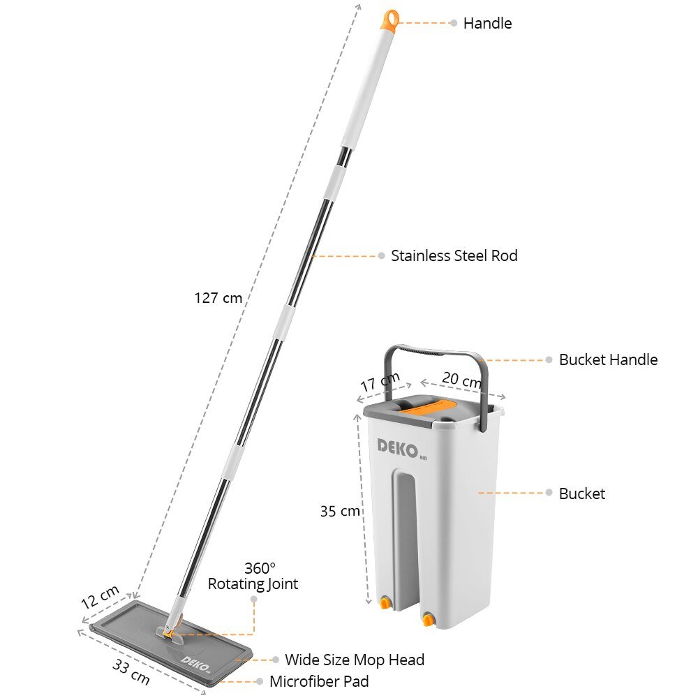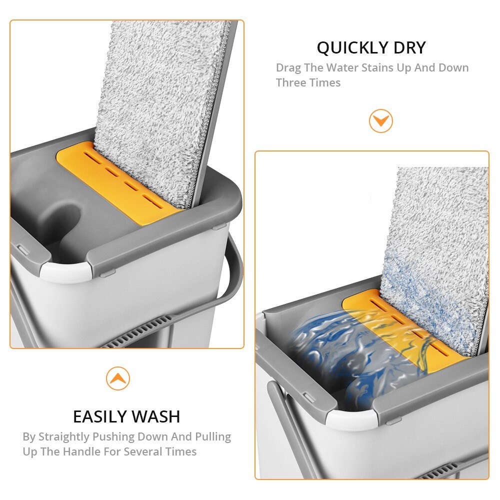 EASY TO USE two chamber bucket featuring one WASH and one DRY side. Once washed, the mop head is placed in the dry chamber to remove excess water. When the desired level of dryness is achieved, mopping is quick and effortless. The cleaned surfaces dry quickly without water marks or streaks. No more drying the floor with a towel after moping.